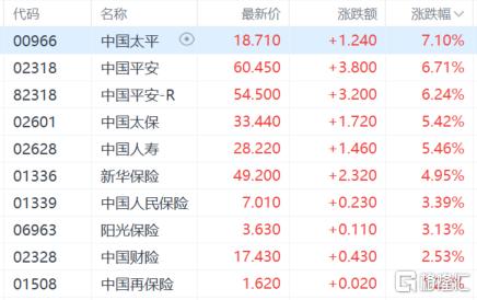 保险股表现活跃,中国太平涨超7%领涨板块,中国平安涨超6%,中国太保、中国人寿涨超5%。