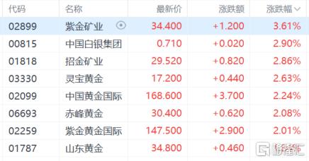 黄金股震荡走高,紫金矿业涨超3%,中国白银集团、招金矿业、灵宝黄金、中国黄金国际涨超2%。