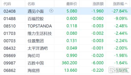 餐饮股走低,遇见小面跌超27%,百福控股跌超9%,海伦司、百胜中国、海底捞等跟跌。