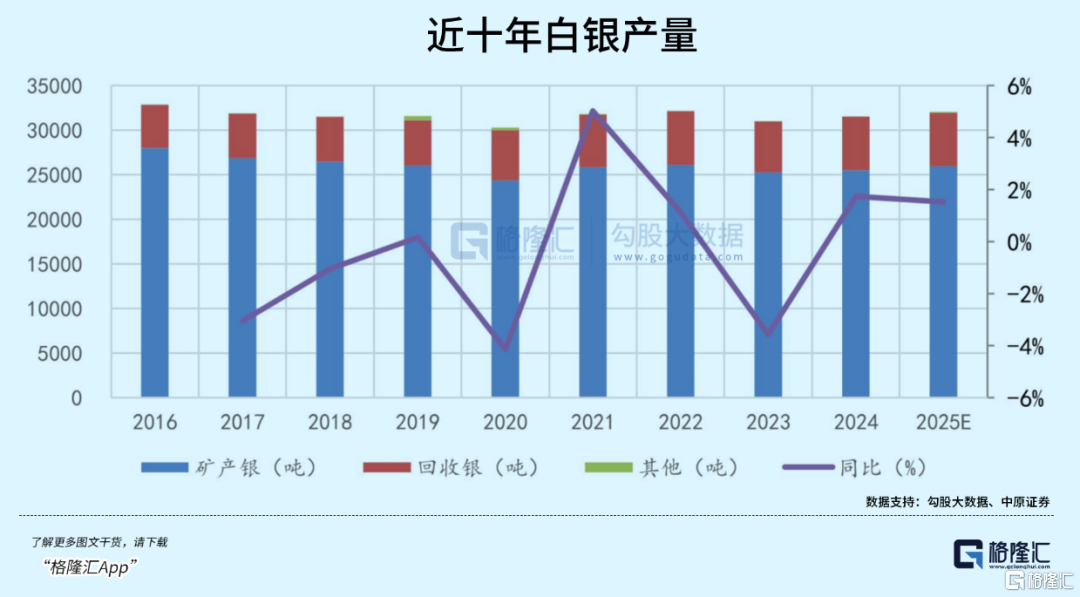据世界白银协会发布的《世界白银调查》,2023、2024年全球矿产银都约为8.3亿盎司,2025年下降至8.2亿盎司左右。