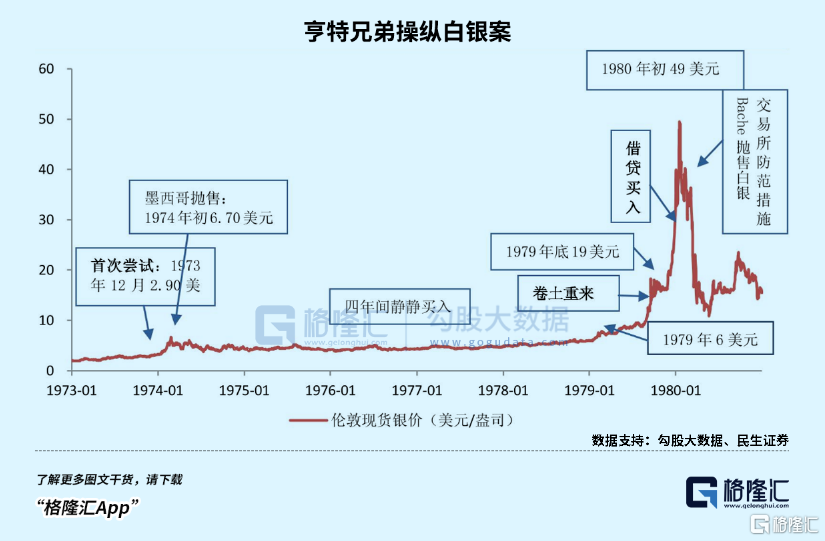 在刻意炒作下,硬是在1980年初,把银价推高到50美元/盎司的历史最高水平,导致白银走私案席卷全球,无数人一夜暴富。