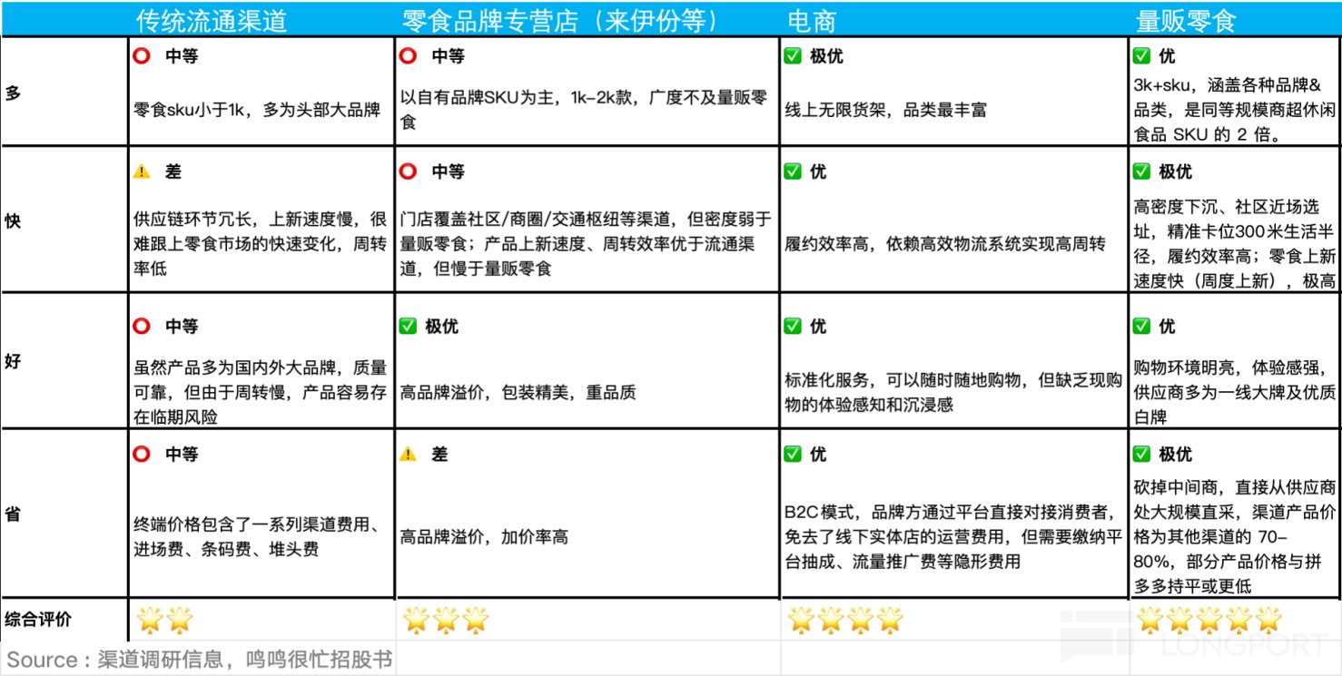 在量贩零食店出现以前,国内消费者购买休闲零食的主流渠道无外乎线下的传统商超、夫妻老婆店等为代表的流通渠道、零食品牌专营店(良品铺子、来伊份)以及线上的电商渠道。为了让各位投资者了解很忙深耕的量贩零食和其他零售渠道的区别,海豚君在下表从零售业态的经典框架 “多快好省” 对各渠道进行了详细梳理: