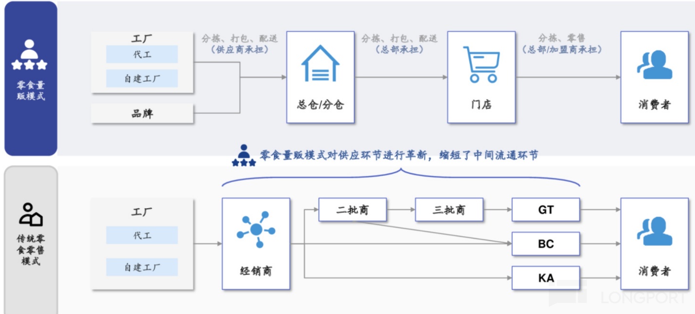 - 零食品牌专营店:高成本 高效率。21 世纪初,以来伊份为代表的零食品牌专营店横空出世,第一次将零食从散装、非标品提升到品牌化的高度。另外,相较于传统流通环节冗长的渠道层级,零食品牌专营店砍掉了经销商,采用短链经营(工厂——品牌中心仓——品牌门店),并建立了高标准的门店系统,提升了商品的新鲜度和购买体验,对物流、仓储等各个环节的信息流也实现了完全的自主掌控,效率大幅提升。