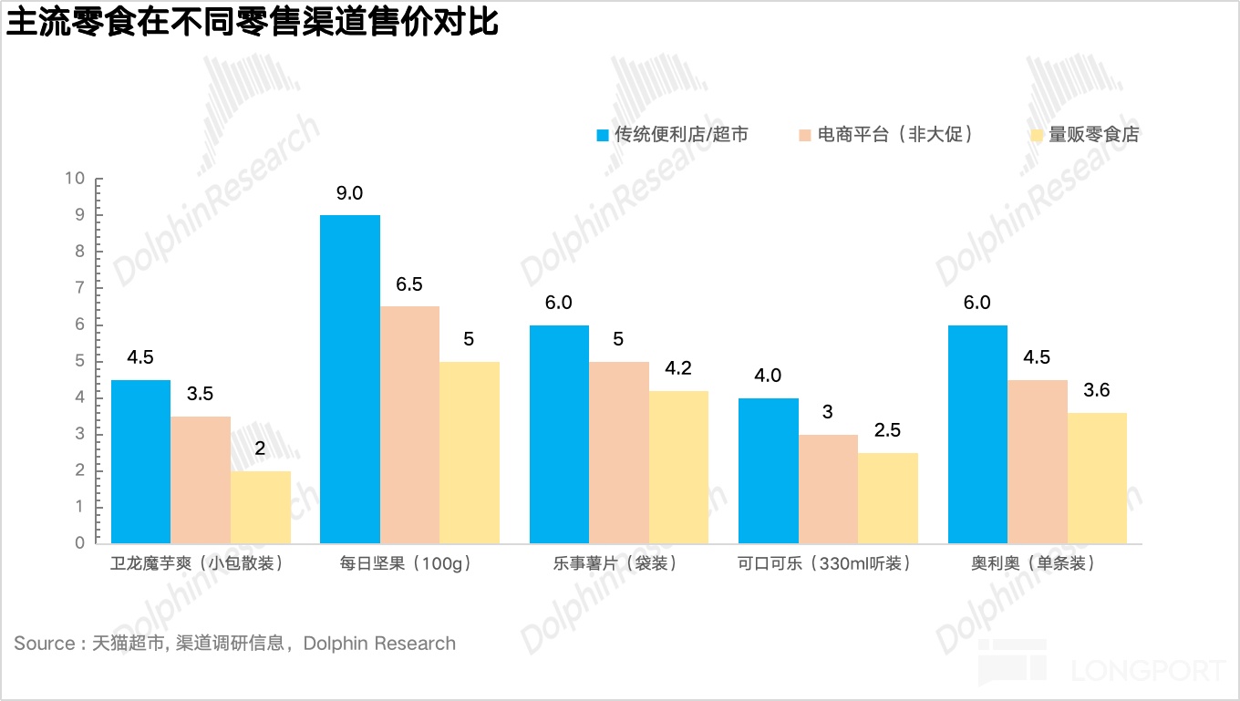 从价格上看,量贩零食的全渠道加价率(出厂到终端零售价之间的价差)仅有 30%-40%,是传统流通渠道的一半(加价率普遍在 70%-80% 以上)。从下图可以看到,同品牌、同规格的产品在量贩零食渠道的价格是市面上的最低价,比电商还要低 20%-30% 左右。