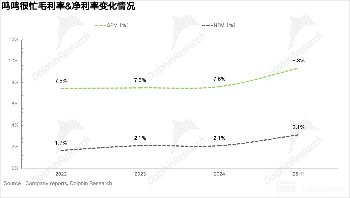 根据招股书,从下图可以看到过去三年很忙的毛利率稳定在 7%-8% 之间,处于极低的水平。(25 年上半年,很忙和赵一鸣零食内部整合结束,议价能力强化带动整体毛利率有所提升)