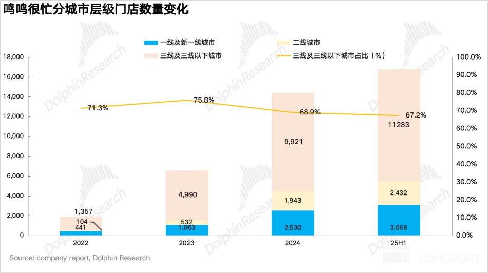 而从门店分布上看,从下图可以看到很忙三线及以下门店占比接近 70%(58% 的门店位于县城和乡镇),是极度下沉的零售业态。近年来随着新增门店的选址重心向一二线城市倾斜,很忙下沉市场占比逐步下滑,和古茗类似,采用的是 “农村包围城市” 的扩张打法。