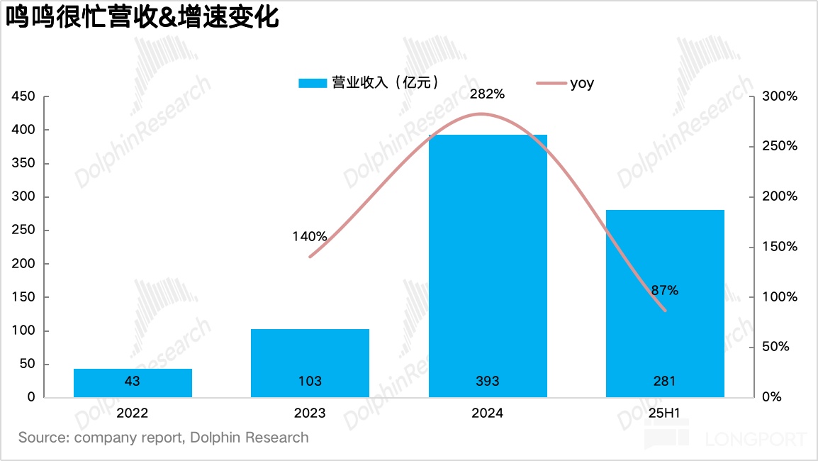 开店狂飙也带动很忙的营收从 2022 年的 43 亿元迅速提升至 2024 年的 393 亿元,CAGR 达到 202%。(其中 2024 年高速增长和零食很忙和赵一鸣零食在 2023 年底并表有关)