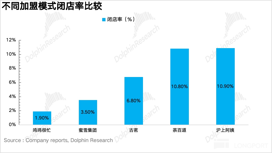从下图可以看到,同样是价格战最激烈的 2024 年,可以看到很忙的闭店率仅有 1.9%,远低于各头部茶饮品牌。