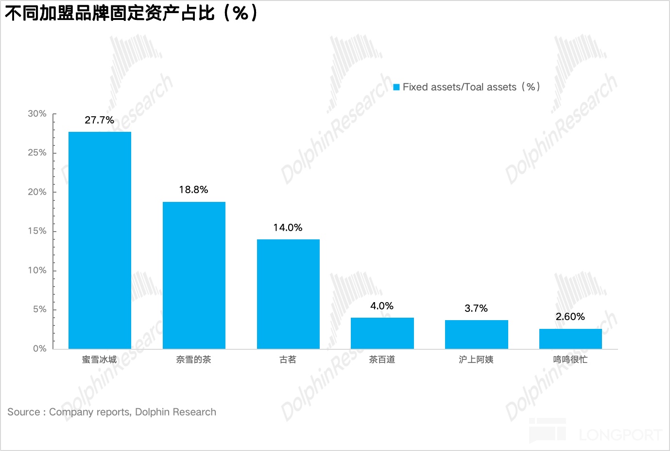 由于公司 98% 的门店均为加盟模式,加盟商承担实际的开店&运营成本,且公司不需要像茶饮一样自建厂房生产实际的原材料,免去了制造环节,因此固定资产投入很低,从下图可以看到很忙的固定资产占比仅为 2.6%,是高度轻资产运营的模式。
