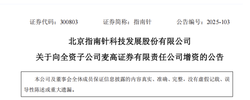 12月4日,指南针公告拟向全资子公司麦高证券增资1亿元,注册资本将升至15亿元,这已是其第4次增资,累计投入达25亿元。此前定增方案终止后,麦高证券还计划发行不超6亿元次级债“补血”。指南针称增资是为满足麦高证券业务发展资金需求。