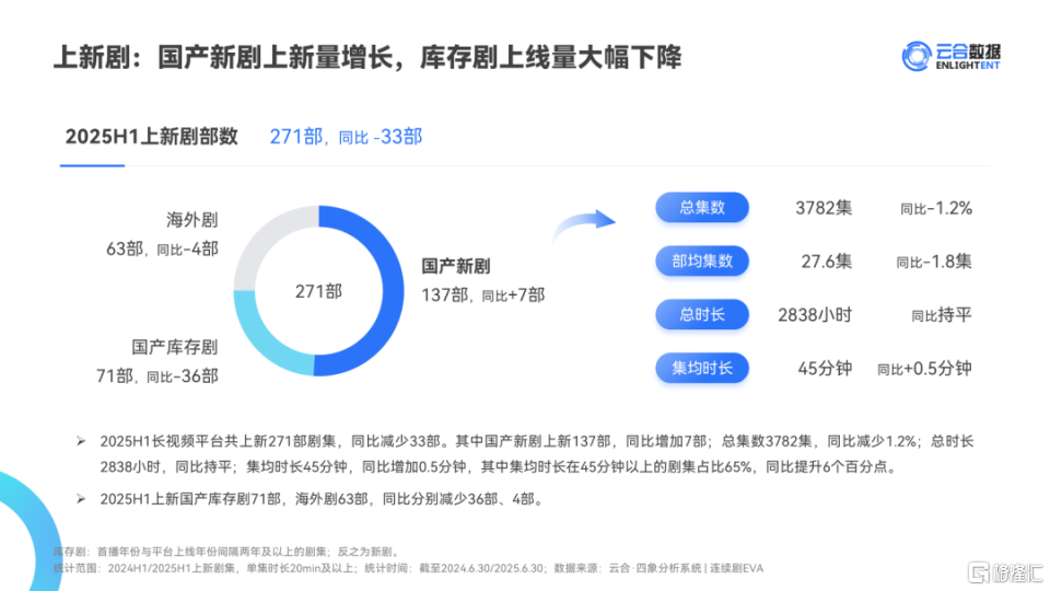 今年上半年,长视频平台共上新271部剧集,其中国产新剧137部,同比增加7部,但库存剧71部,同比减少36部。