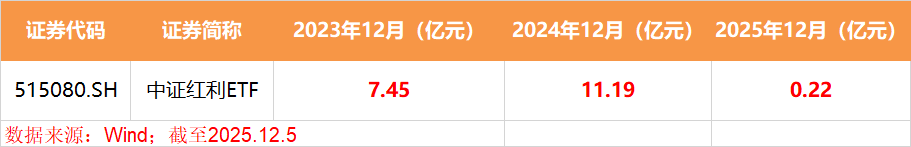中证红利ETF515080为例,wind数据显示,2023年、2024年12月,该ETF月度净流入额分别为7.45亿元、11.19亿元,显示出较强的资金流入效应。今年12月,中证红利ETF515080)区间累计净流入额为0.22亿元;拉长周期看,近10日该ETF区间累计净流入额达2.7亿元