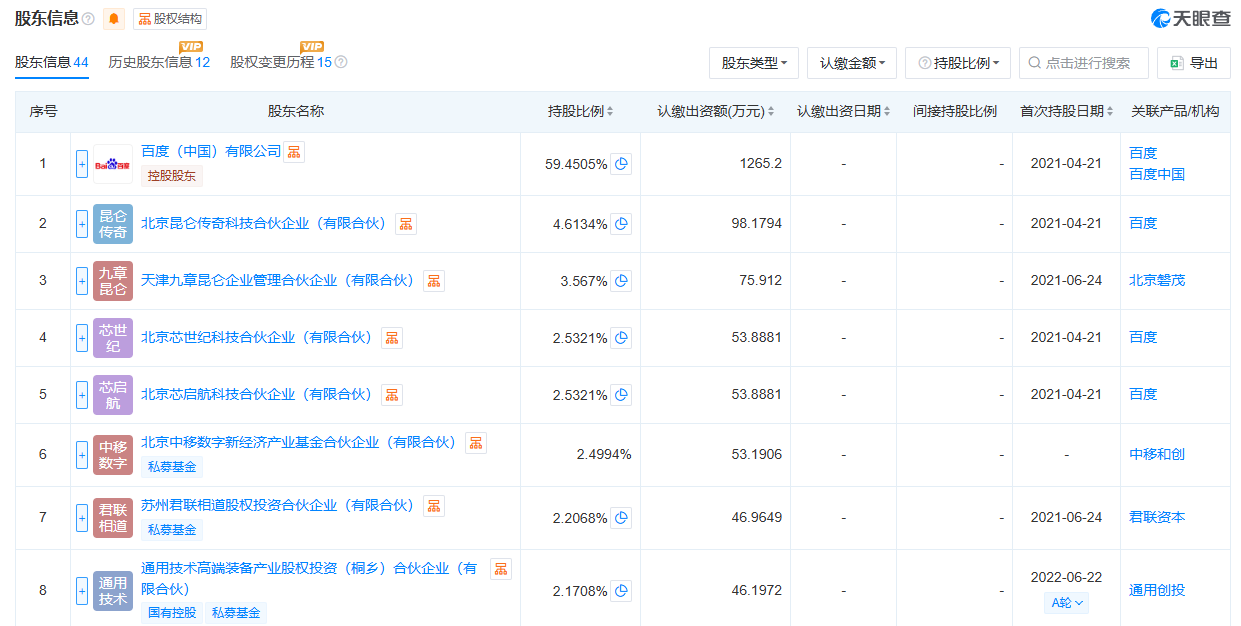 天眼查信息显示,截至2025年7月,昆仑芯已完成D轮融资,投资方涵盖比亚迪、银河源汇、国新基金下属高层次人才基金、山证投资等机构。股权结构方面,百度(中国)有限公司为昆仑芯控股股东,持股比例达59.45%。