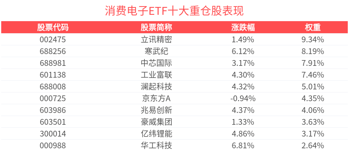 数据显示,截至2025年11月28日,中证消费电子主题指数(931494)前十大权重股分别为立讯精密(002475)、寒武纪(688256)、工业富联(601138)、中芯国际(688981)、京东方A(000725)、澜起科技(688008)、兆易创新(603986)、豪威集团(603501)、东山精密(002384)、亿纬锂能(300014),前十大权重股合计占比56.39%。(以上所列股票仅为指数成份股,无特定推荐之意)