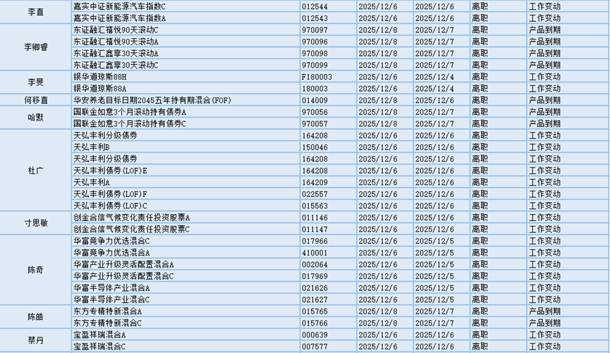 基金经理是一只基金产品最核心的成员,能决定一只基金的投资方向、投资策略以及投资风格,基金经理出色的择时选股能力和调研预测能力是基金业绩的有力保证,所以基金经理是投资者在选择基金产品时的重要依据。基金经理的变动很大程度上会影响到基金产品未来的表现,是一个需要特别关注的信息。12月6日到12月8日共有43位基金经理发生任职变动。