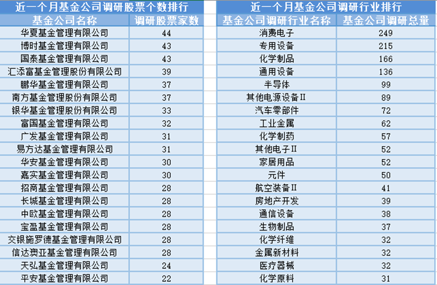 近一个月(11月8日-12月8日),华夏基金参与公司调研的数量最多,共调研44家上市公司,此外调研较为活跃的还有博时基金、国泰基金和汇添富基金,分别调研43家、43家、39家上市公司;从调研行业上来看,基金公司对消费电子行业的上市公司调研次数最多,共有249次,其次是专用设备行业,基金公司调研了215次。