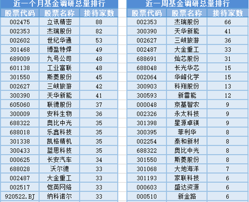 从个股调研情况上来看,最近1个月(11月8日-12月8日)最受公募基金关注的是立讯精密,立讯精密属于消费电子行业,主营业务为消费电子、通信及数据中心、汽车、医疗等领域相关零组件、模组及系统集成业务。共有88家基金管理公司参与调研,其次是杰瑞股份和世纪华通,分别接受82家、53家基金管理公司的调研。
