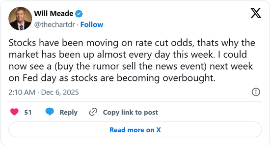 eToro美国投资分析师布雷特・肯韦尔(Bret Kenwell)也表示,“我认为关键在于美联储对2026年经济和政策前景的预测,这将决定市场月底能否迎来‘圣诞老人行情’。我们将能清晰了解美联储的立场及其对明年的预期,这将定下市场基调。”