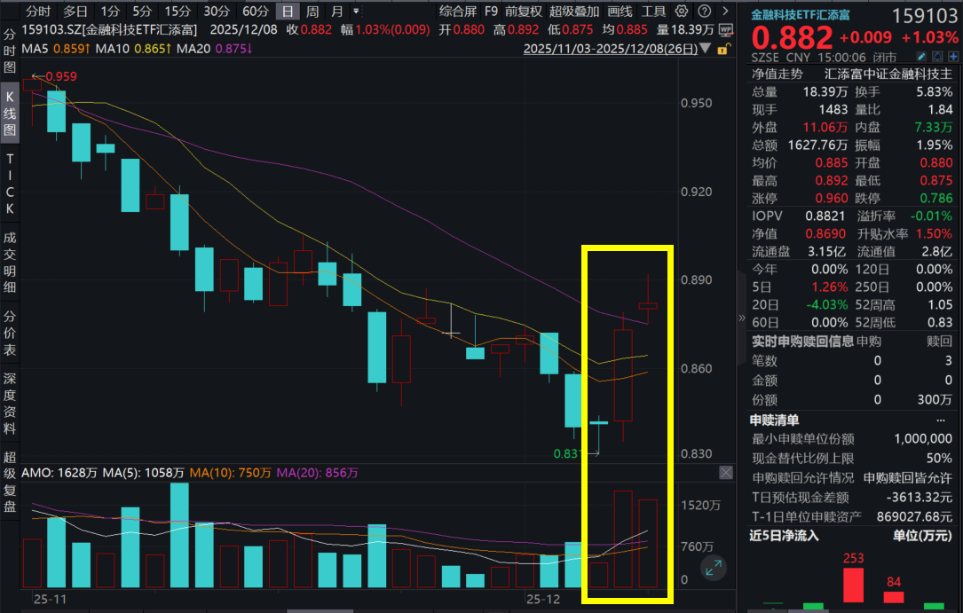 12月8日,A股市场震荡上行!“旗手2.0”金融科技ETF汇添富(159103)跳空高开,一度涨超2%,收涨1.03%,喜提3连涨。