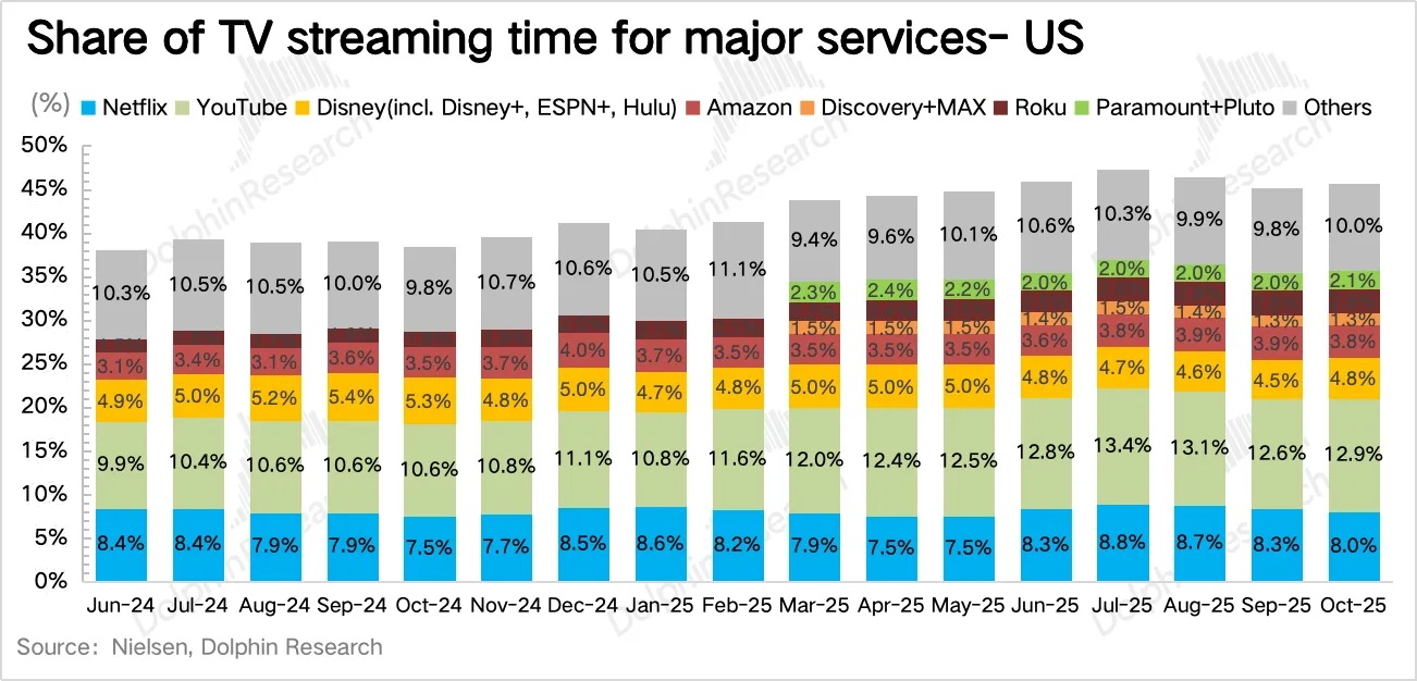 在流媒体领域,Netflix 用户 3.2 亿,WBO 旗下的 HBO MAX 用户 1.2 亿,其中美国地区分别为 0.9 亿和 0.24 亿,合计占到了美国总用户规模的 34%(根据 MNTN 研究,2025 年 Q2 美国流媒体订阅用户数达到 3.4 亿)。