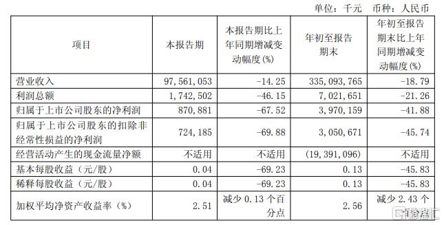 前三季度营收为3350.94亿元,同比下降18.79%;净利润为39.7亿元,同比下降41.88%。