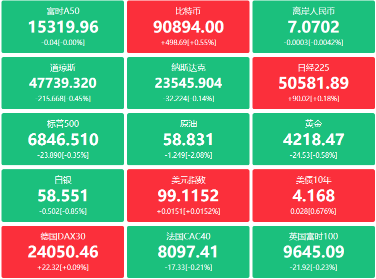 期货:现货黄金跌0.19%报4189.69美元,黄金期货跌0.56%报4219.20美元;现货白银跌0.37%报58.1254美元,白银期货跌0.97%报58.480美元;铜期货跌0.67%报5.4255美元,现货铂金涨0.35%,现货钯金涨0.99%;原油期货跌1.20美元,跌幅2.00%报58.88美元;布伦特原油期货跌1.26美元,跌幅1.98%报62.49美元;天然气期货跌近6.97%,报4.9120美元;汽油期货报1.7981美元,取暖油期货报2.2982美元。
