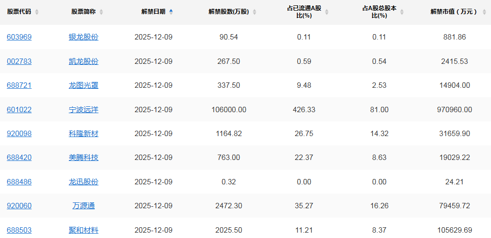【限售解禁】