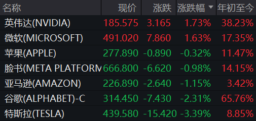 板块方面,材料、能源和电信板块领跌,跌幅均超1%,而科技和半导体板块逆势撑盘。万得美国科技七巨头指数微跌0.28%,大型科技股表现分化:微软和英伟达分别上涨1.63%和1.72%,谷歌、亚马逊和Meta则下跌超1%。特斯拉重挫3.4%,主要受摩根士丹利下调评级影响,分析师认为其估值偏高且2026年将面临波动交易环境。值得注意的是,部分芯片股在盘后交易中走强,英伟达、AMD涨幅均超2%,英特尔也上涨0.7%。