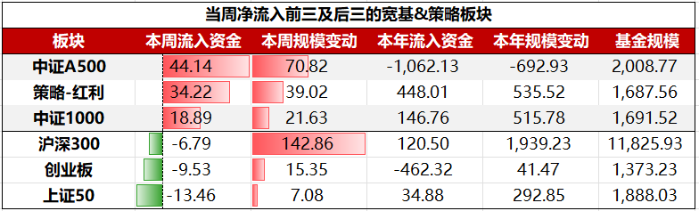具体到细分板块,宽基&策略板块ETF中,净流入前三大板块依次为:中证A500、策略-红利、中证1000;净流出前三大板块依次为:上证50、创业板、沪深300。