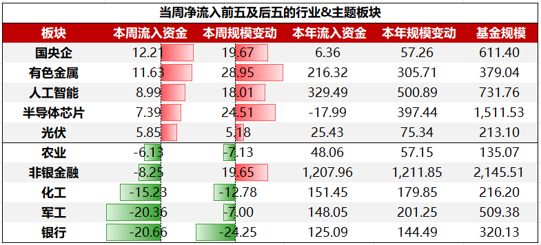 行业&主题板块ETF中,净流入前五大板块依次为:国央企、有色金属、人工智能、半导体芯片、光伏;净流出前五大板块依次为:银行、军工、化工、非银金融、农业。