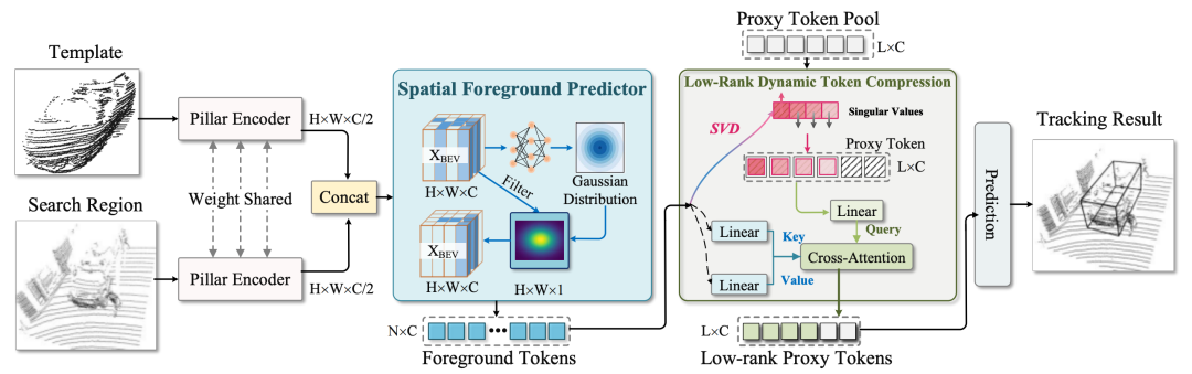 3. 绕过 SVD,实现「端到端」训练:SVD 本身是不可微分的,无法直接用于训练。CompTrack 巧妙地将其用作一个「引导者」:SVD 只负责在前向传播时提供最优的压缩率 K 和特征基(prior),而真正的压缩则由一个可学习的、基于 K 的 Cross-Attention 模块完成 。这使得整个高效压缩流程可以端到端训练。