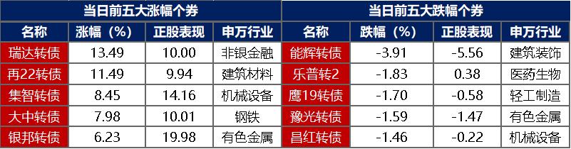 【转债市场主要指数集体跟涨】 12月8日,转债市场跟随权益市场继续上涨,当日中证转债、上证转债、深证转债分别收涨0.40%、0.32%、0.50%。当日,转债市场成交额652.92亿元,较前一交易日放量51.39亿元。转债市场大多上涨,397支转债中,258支收涨,129支下跌,10支持平。当日上涨个券中,瑞达转债涨超13%,再22转债涨超11%;下跌个券中,能辉转债跌逾3%,乐普转2等9支转债跌逾1%。