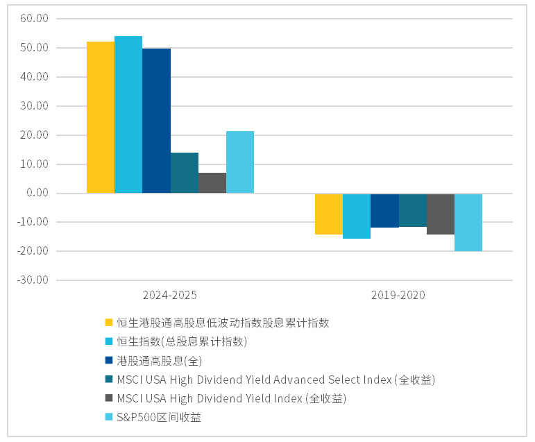 24年 - 25年10月降息周期: 美联储采取预防性降息策略,避免经济硬着陆,将利率从5.0%降至4.0%。期间恒生港股通高股息低波动指数上涨52.10%,上涨幅度明显。这种差异不仅存在于港股,美国高股息指数同样呈现分化:预防性降息周期中,标普美国股息增长指数上涨11.60%;而2020年危机性降息中则下跌18.56%, 略好于同期S&P500指数的表现(收跌19.9%)。