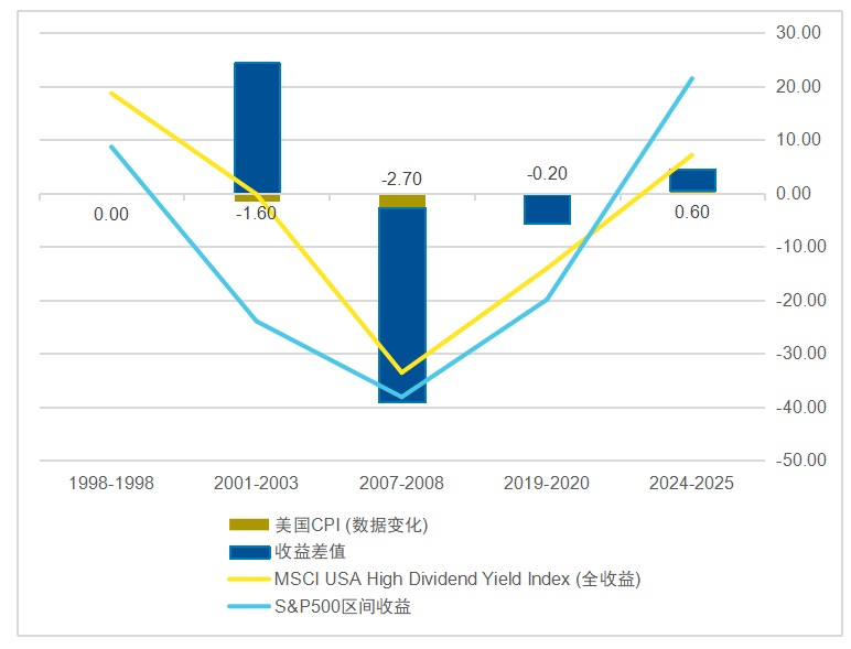 以2001-2003年降息周期为例,CPI温和下降同时金融板块受互联网泡沫破裂影响相对较小,美国高股息指数相对标普500相对超额优秀;相比之下,0708年的次贷危机中,CPI回落明显,金融板块额外承压,红利指数收益表现与美股大盘回落幅度相近。