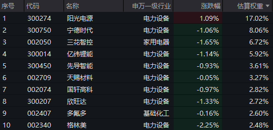 电池50ETF(159796)标的指数成分股多数回调,阳光电源逆势涨超1%,宁德时代、三花智控、亿纬锂能等跌超1%,先导智能、天赐材料等回调。