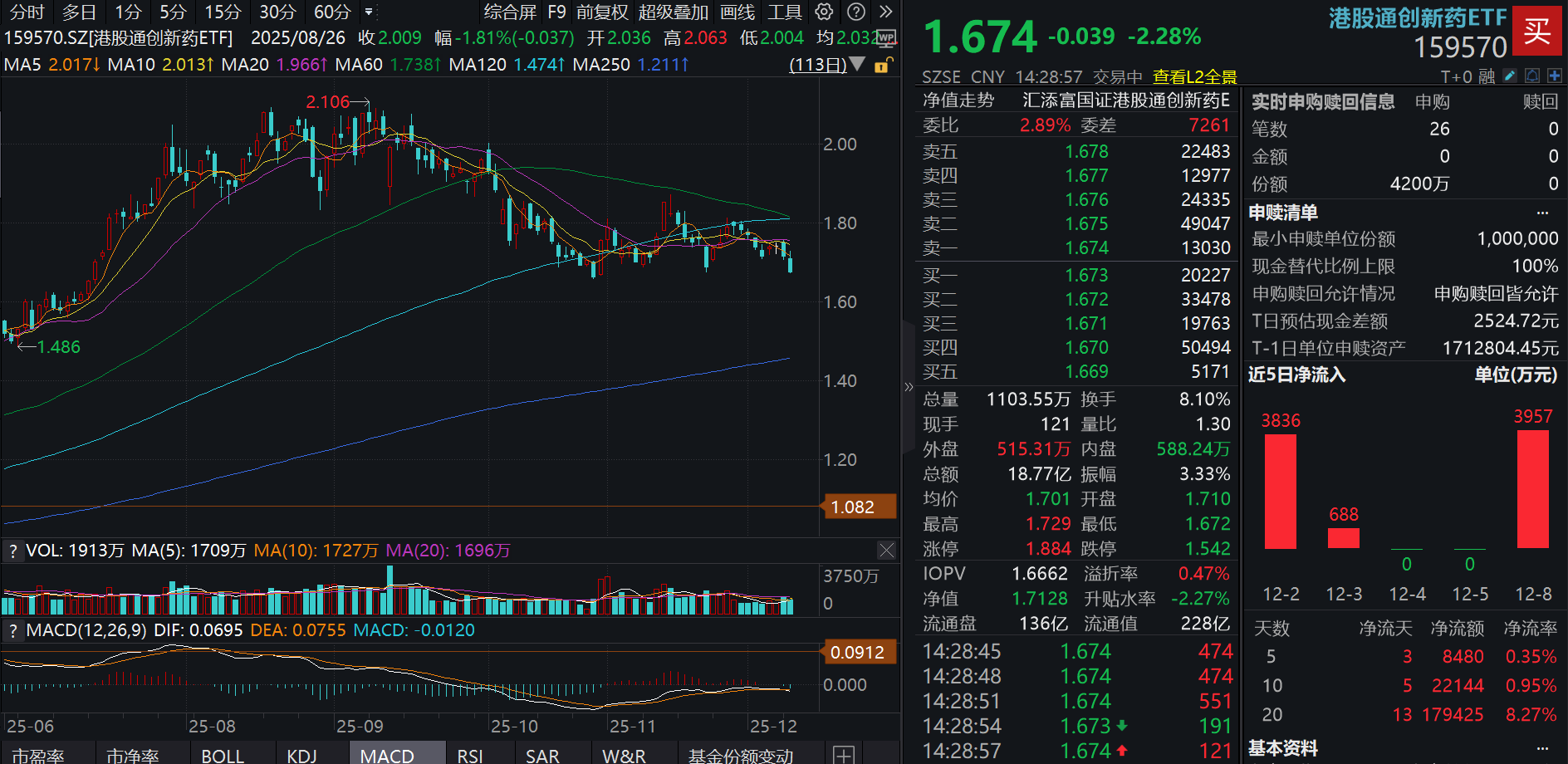 今日(12.9),港药再度回调,创新药纯度100%的港股通创新药ETF(159570)跌超2%,成交额快速突破19亿元!资金面上,盘中再获超7100万元净流入,近20日累计“吸金”超17.9亿元!截至12月8日,港股通创新药ETF(159570)最新规模超233亿元,同类持续领先!