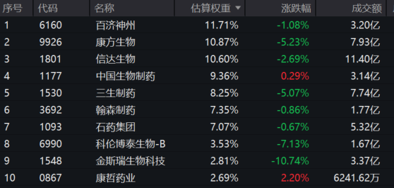 港股通创新药ETF(159570)标的指数权重股多数飘绿:金斯瑞生物科技跌超10%,科伦博泰生物-B跌超7%,康方生物、三生制药跌超5%,信达生物跌超2%,百济神州跌超1%。