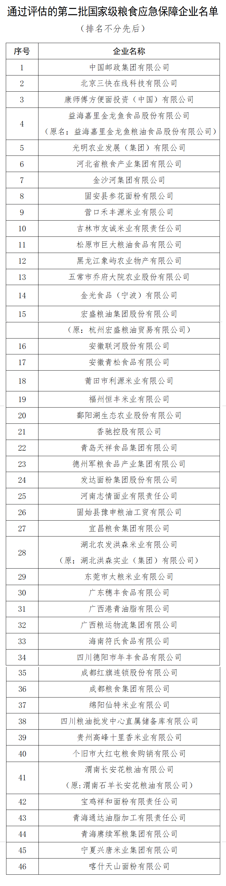据悉,此次国家级粮食应急保障企业的认定,依据《粮食应急保障企业管理办法》严格开展,是对2022年选定的第二批国家级粮食应急保障企业开展全面评估后确定的最终结果,核心目的在于筛选出在应急状态下能够高效完成粮食收购、储存、加工、运输和供应等关键任务的优质企业,筑牢国家粮食安全防线。按照有关程序,公示时间为2025年12月1日至12月5日,最终,中国邮政集团有限公司等46家企业正式入选。