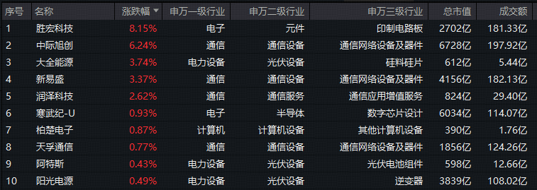 成份股方面,CPO概念股胜宏科技领涨超8%;光模块三巨头中际旭创、新易盛、天孚通信分别上涨6.24%、3.37%和0.77%;AI芯片龙头寒武纪涨近1%股价再度超越贵州茅台,位居A股第一;光伏龙头大全能源涨超3%,阿特斯、阳光电源飘红。