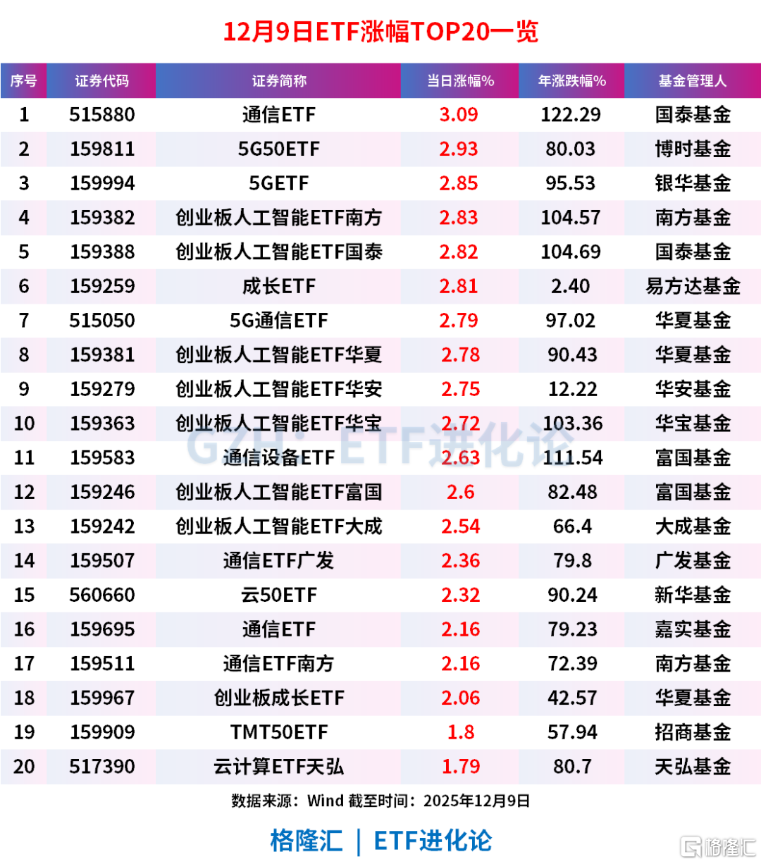 “AI算力含量高”的ETF再一次屠榜,通信ETF涨3%,5G50ETF、5GETF、创业板人工智能ETF均涨超2%。