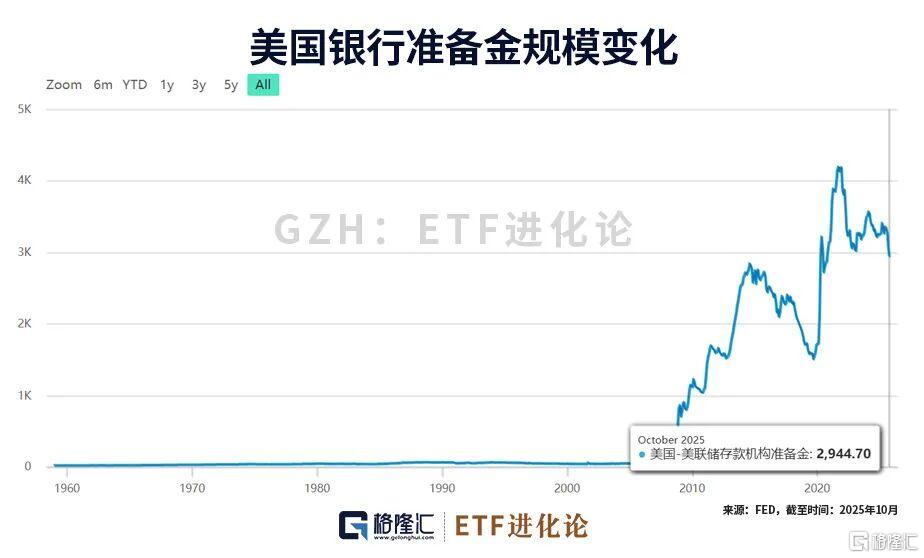 原来经过连续三年缩表,美国银行体系准备金10月萎缩至为2.94万亿美元,是2020年10月以来第二次跌破3万亿关口(第一次是今年1月1日当周,可以回忆一下彼时美股12月和1月的表现。),已接近美联储设定的"充足但不过度"水平,是美联储决定停止缩表的关键因素。