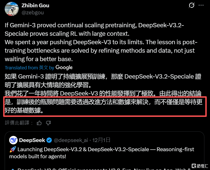 正如Deepseek研究员Zhibin Gou的看法,gemini3证明pretrain Scaling,DeepSeek 3.2证明RL。