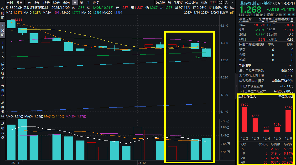 12月9日,A股港股震荡回调,港股红利板块亦受拖累。截至15:00收盘,港股红利ETF基金(513820)跌1.40%,全天溢价坚挺,或反映买盘活跃!截至12月8日最新数据,资金已连续6日涌入借道ETF布局港股红利,港股红利ETF基金(513820)合计“吸金”超3亿元,基金最新融资余额超3800万元,亦创纳入两融标的以来新高!