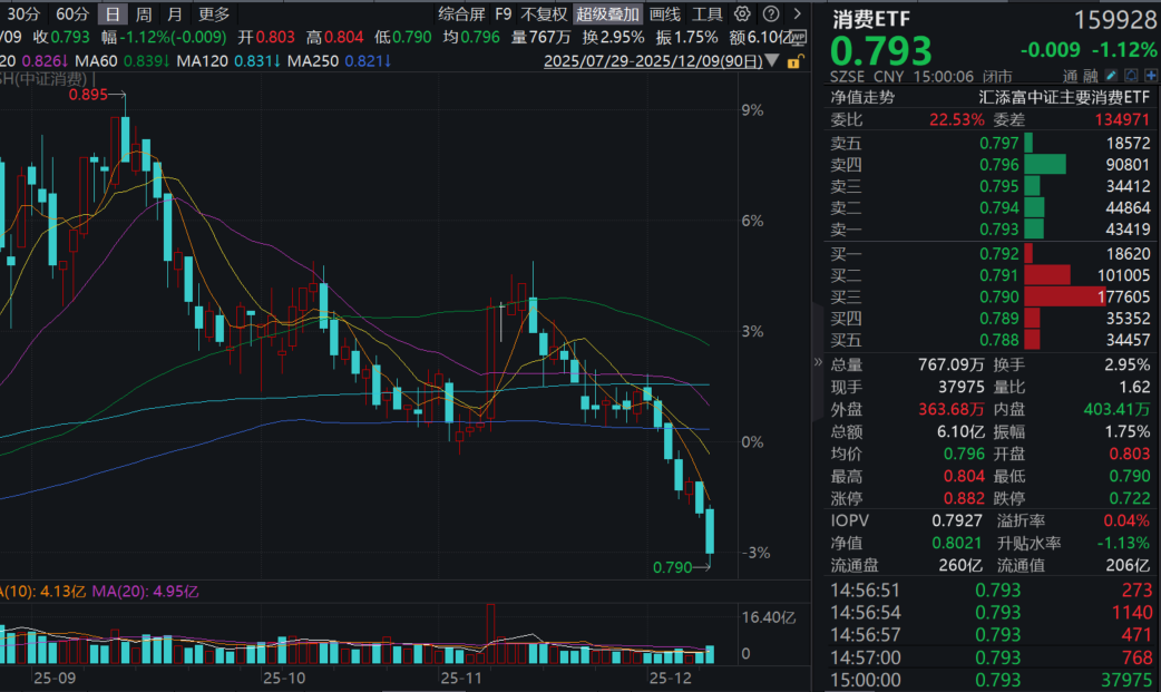 今日(12.9),港股新消费再度回调,港股通消费50ETF(159268)收跌1.58%,全天成交额超3000万元!资金面上,全天“吸金”800万份,规模同类持续领先!港股新消费概念股集体下挫,泡泡玛特跌超5%,周大福跌超4%,老铺黄金跌近3%。(成分股仅做展示,不作为个股推介)
