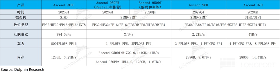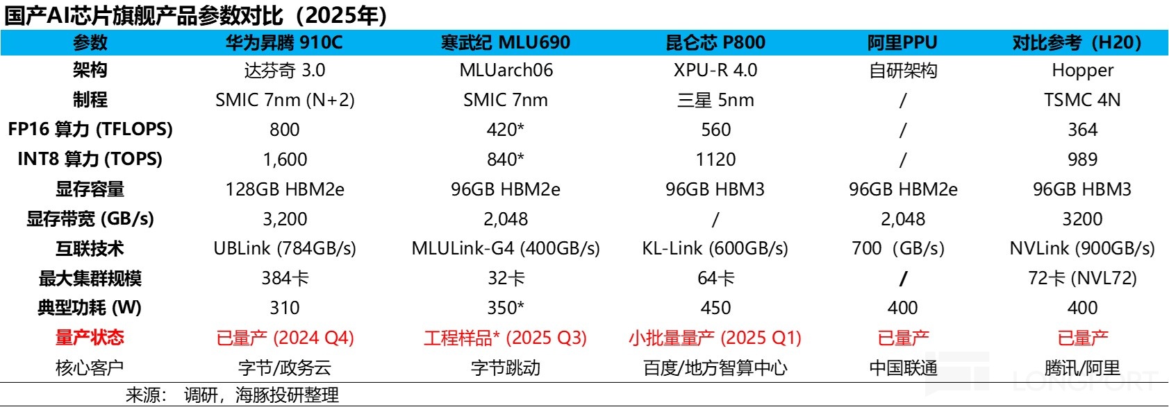 在路线图演进上能看到和 H200 竞争的,要等到华为下一代 950 芯片(适用于 FP8)会是首款能用到训练上,同时内存配置、卡间互联和集群能力都比较强的国产芯片。