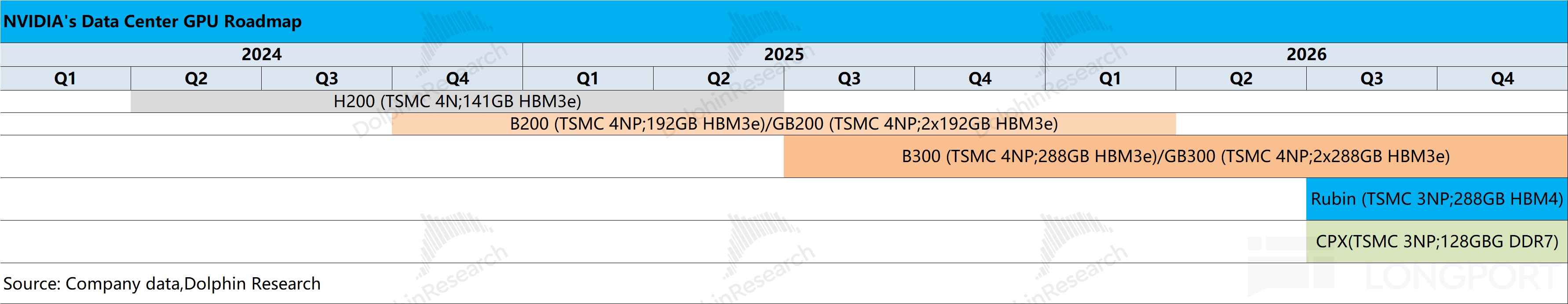换句话说,美国当前开闸的 H200,相比美国接下来新模型的训练芯片 Blackwell 还是有一个代差(英伟达每代产品的时间差基本是 2 年时间,Blackwell 因为更偏系统级解决方案交付,所以上量磨合期较长)。