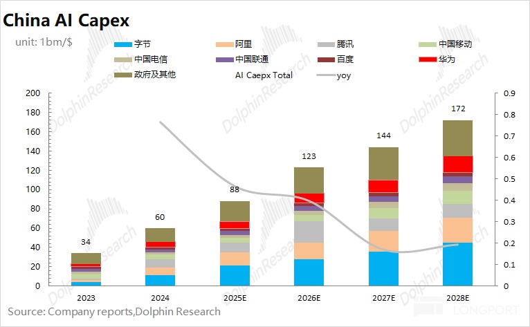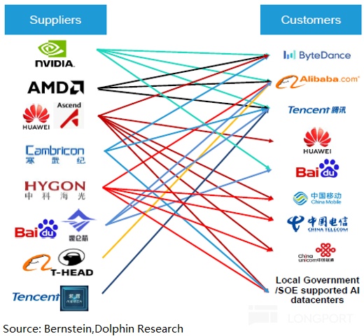 首先,海豚君将中国需要 AI 芯片卡的直接客户分为三类:互联网大厂(字节、腾讯、阿里、百度)、华为云、运营商及政企云(中国移动、中国联通、中国电信等)。