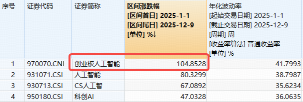 年内复盘看,受益于AI算力需求高景气,光模块CPO等算力硬件迎业绩 估值双击,因光模块CPO含量超56%,创业板人工智能ETF华宝(159363)标的指数频刷新高,年内涨幅高达104.85%已翻倍增长有余,大幅领跑人工智能、CS人工智、科创AI等同类AI主题类指数!