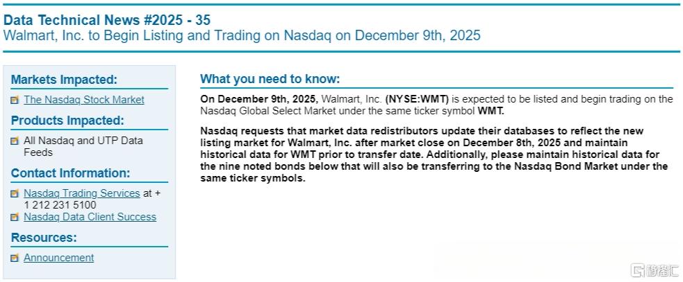 同时,沃尔玛还将把9只债券的上市地点一并转移至纳斯达克,股票交易代码仍沿用现有代码“WMT”。