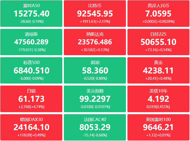 期货:现货黄金涨0.44%报4208.92美元,黄金期货涨0.47%报4237.40美元,现货白银涨4.34%报60.6777美元,白银期货涨4.78%报61.205美元;铜期货跌1.98%报5.3365美元,现货铂金涨2.62%报1697.12美元;现货钯金涨2.41%报1511.46美元;原油期货收跌0.63美元,跌幅1.07%报58.25美元,布伦特原油跌0.55美元,跌幅0.88%报61.94美元;天然气期货报4.5740美元,汽油期货报1.7897美元,取暖油期货报2.2601美元。